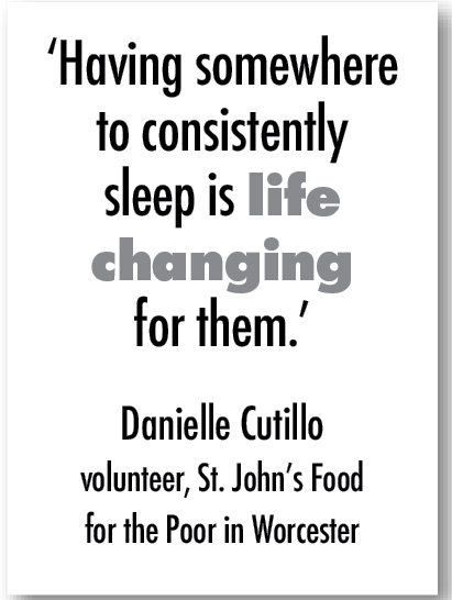 The city provided 46 cots for the shelter at Worcester Tech and St. John’s continues to use them. Fire laws prevent any more beds, but Miss Cutillo said that on some nights the center housed nearly 90 people. Some guests sat on chairs and rested their heads on tables. Some of those who were fortunate enough to get a cot were exhausted and fell asleep as soon as they arrived at 5 p.m.